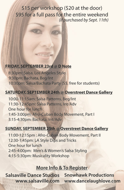 There will be a total of 10 workshops over three days! Here is a quick summary of what will be happening: Friday, September 23: Two workshops at The Highland House from 8:30pm-10:30pm followed by a huge salsa and bachata dancing party after. Saturday, September 24: Four workshops at Overstreet Dance Gallery from 10:00am-4:30pm Sunday, September 25: Four workshops at Overstreet Dance Gallery from 11:00am-5:30pm |