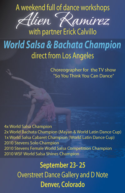 Los Angeles salsa sensation Alien Ramirez and her amazing partner, Erick Calvillo, will be returning to Denver in September for another weekend of fantastic workshops, dancing and fun.